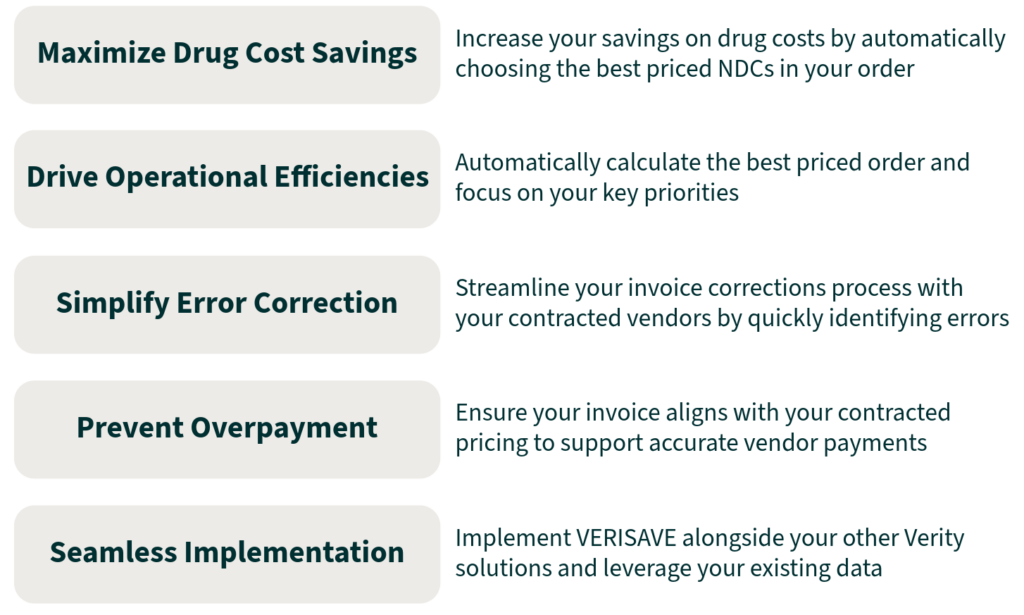 Verisave uses a formula we call the “best blended price”. Our patented technology looks at your catalog pricing, accumulations, and substitution configurations and then dynamically, based on your demand quantity, finds the lowest priced product across a drugs’ GPI. For example, if you have accumulations on 340B but not GPO it will take into consideration the quantity that would be purchased at WAC.